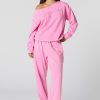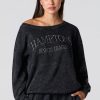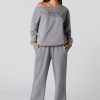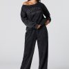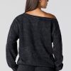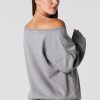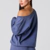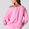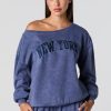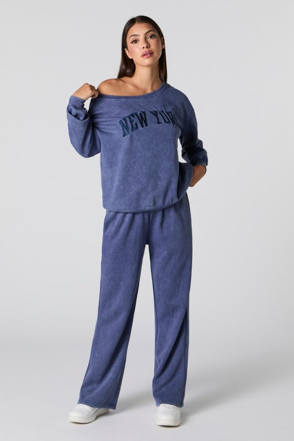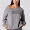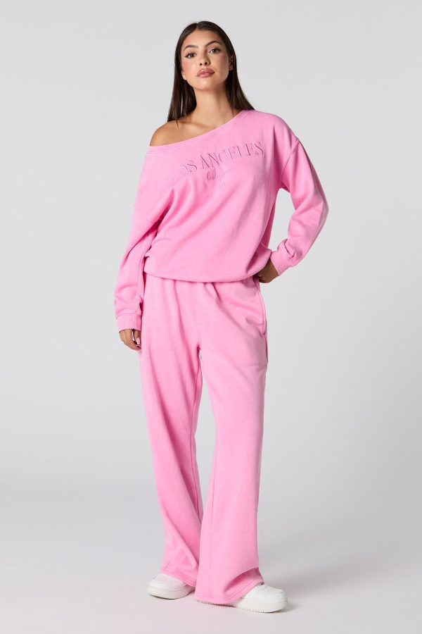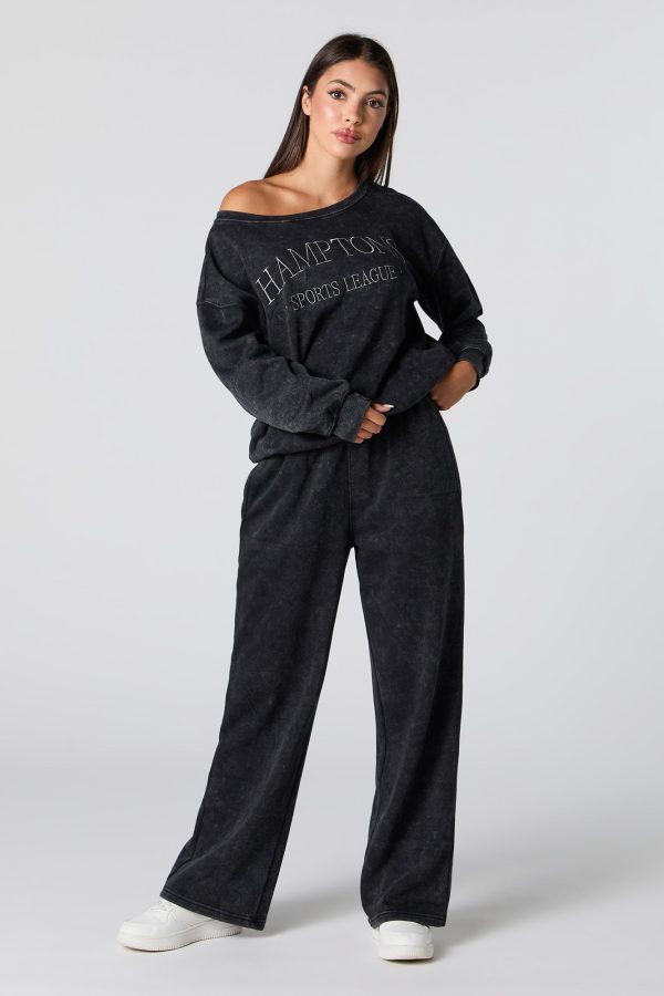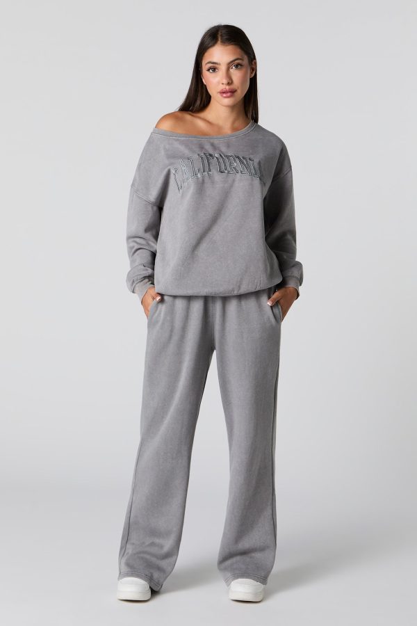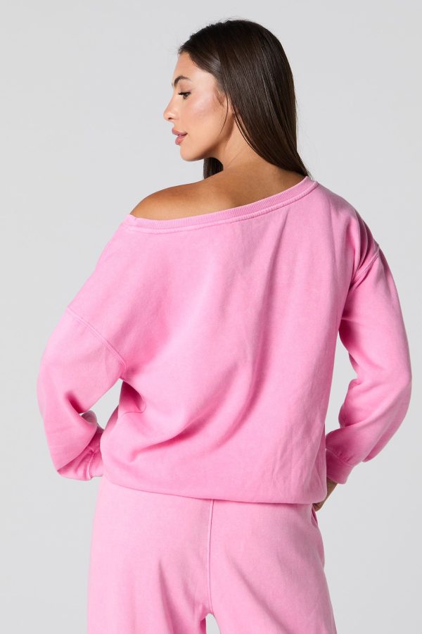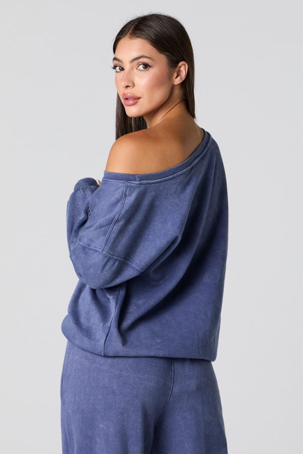 Living in comfy. This sweatshirt features washed fleece material, embroidered front, off-shoulder neckline, and long sleeves. Pair with our Washed Wide Leg Fleece Sweatpant to complete the look.
