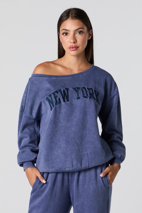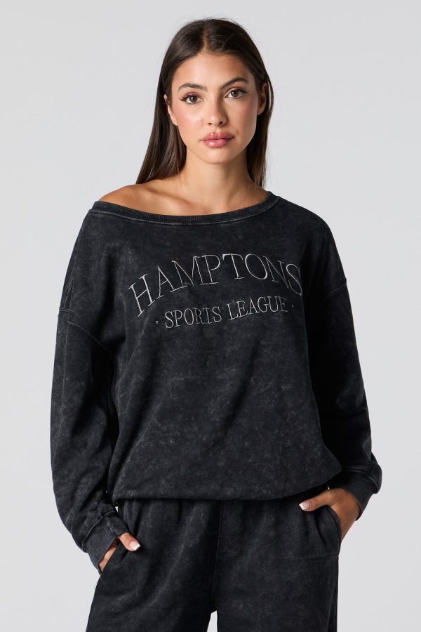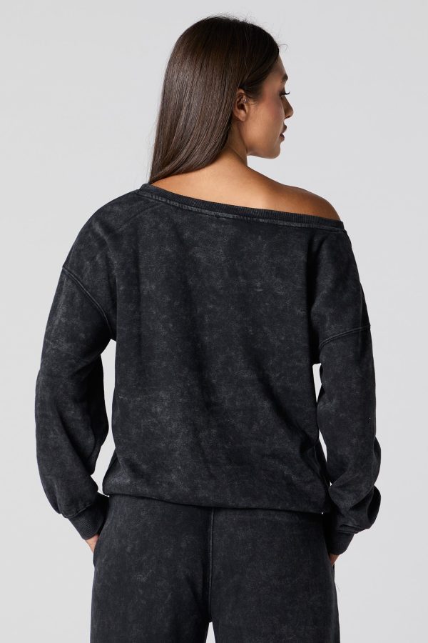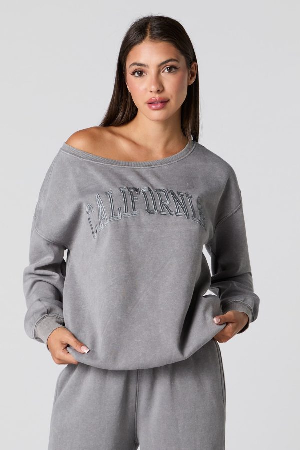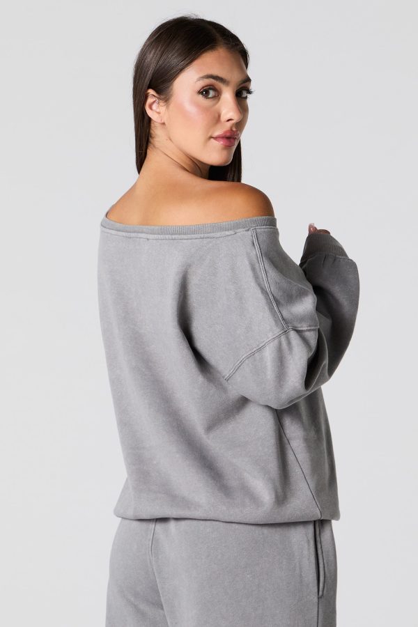 Embroidered Washed Off Shoulder Fleece Sweatshirt