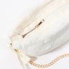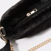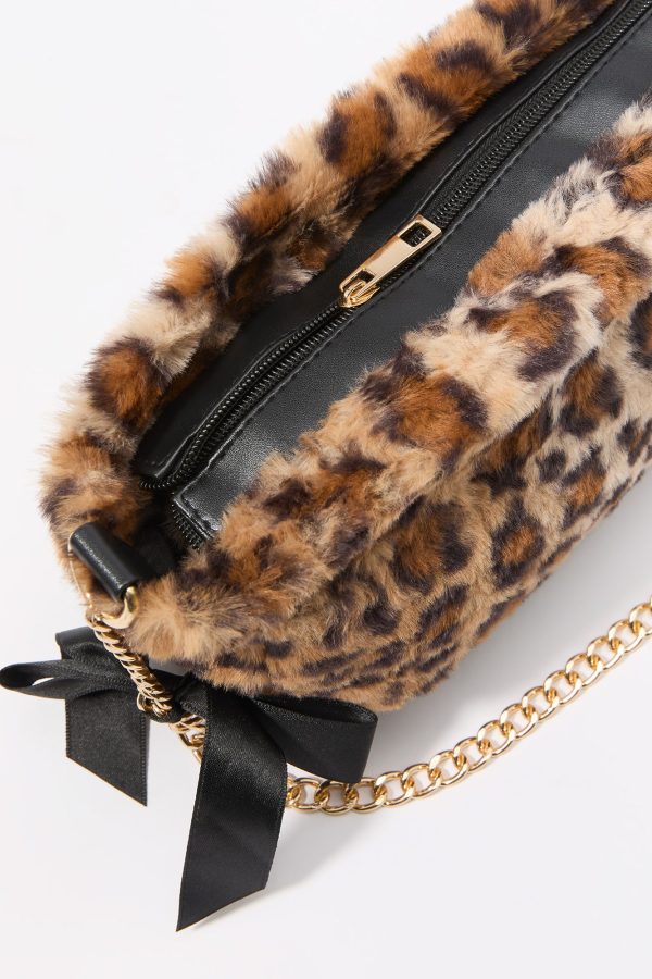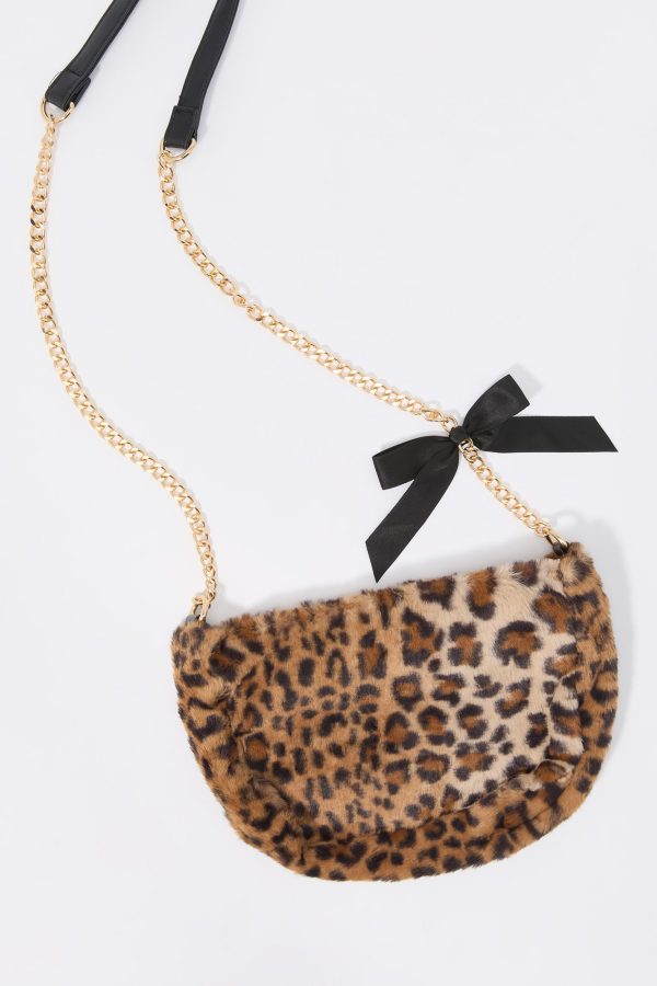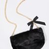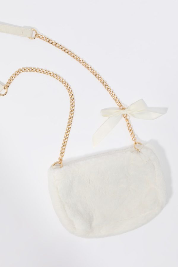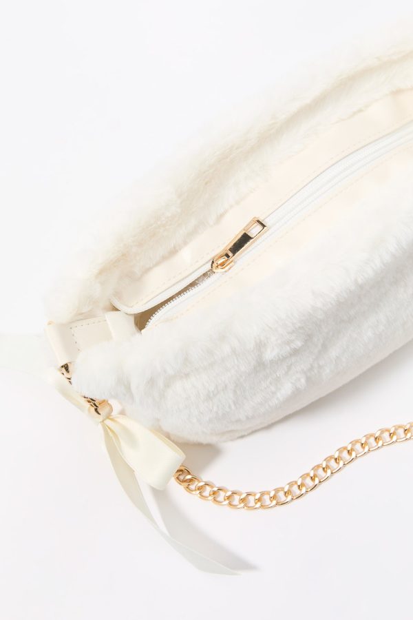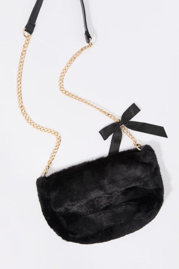 This bag features faux-fur material, zipper compartment, and chain shoulder strap with satin bow.