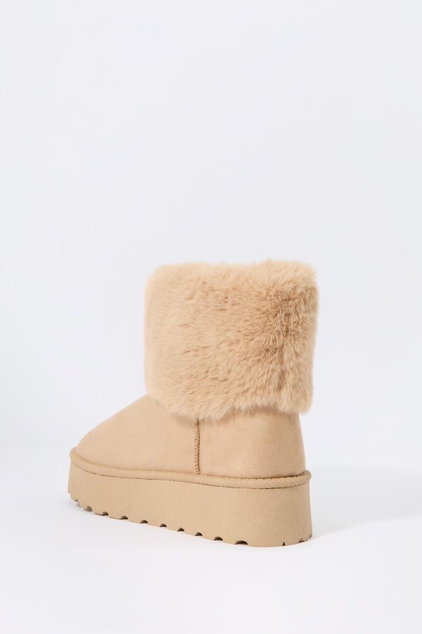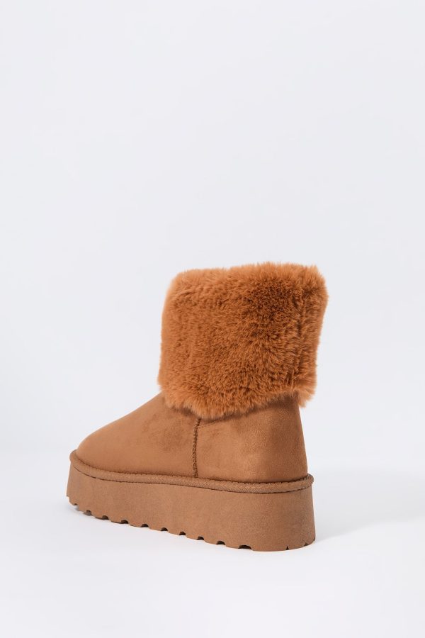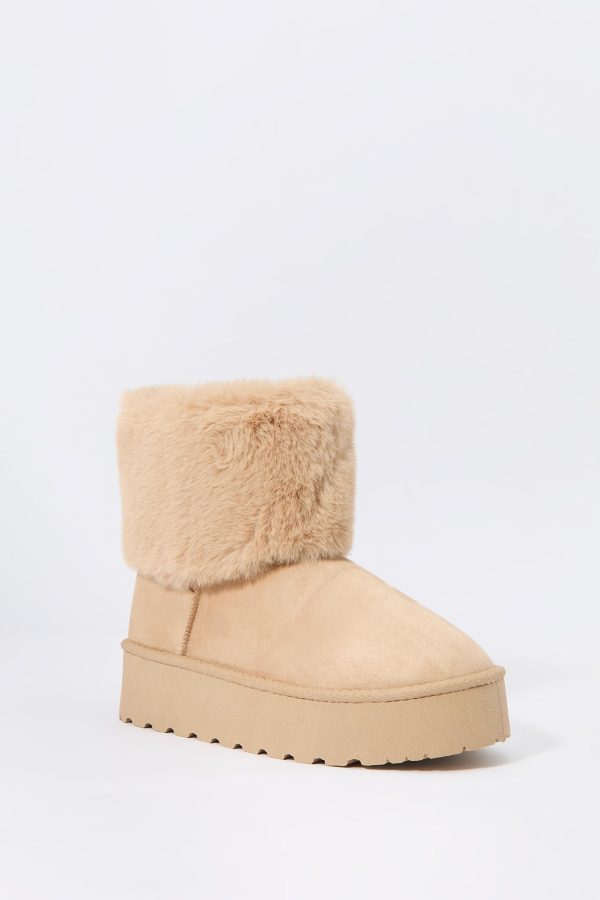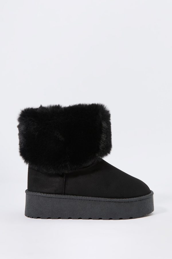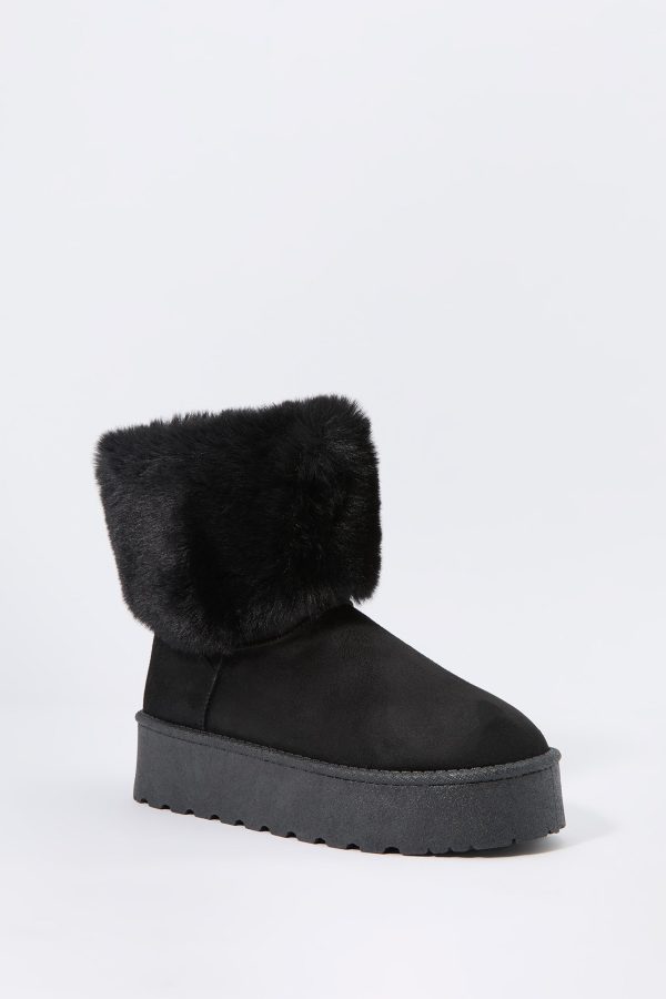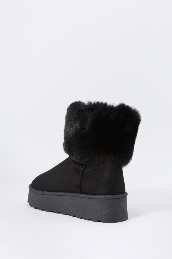 Hey, cozy girl! This fierce footwear is a new season must-have. This boot features faux-suede material, faux-fur collar, and platform sole.