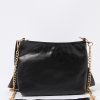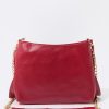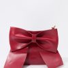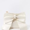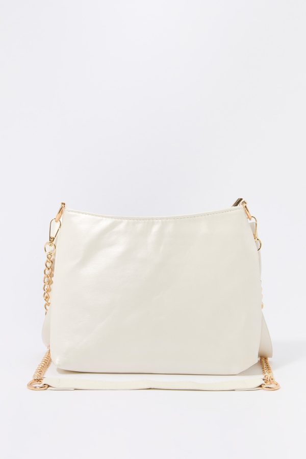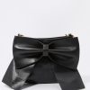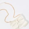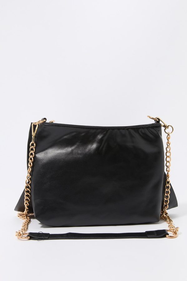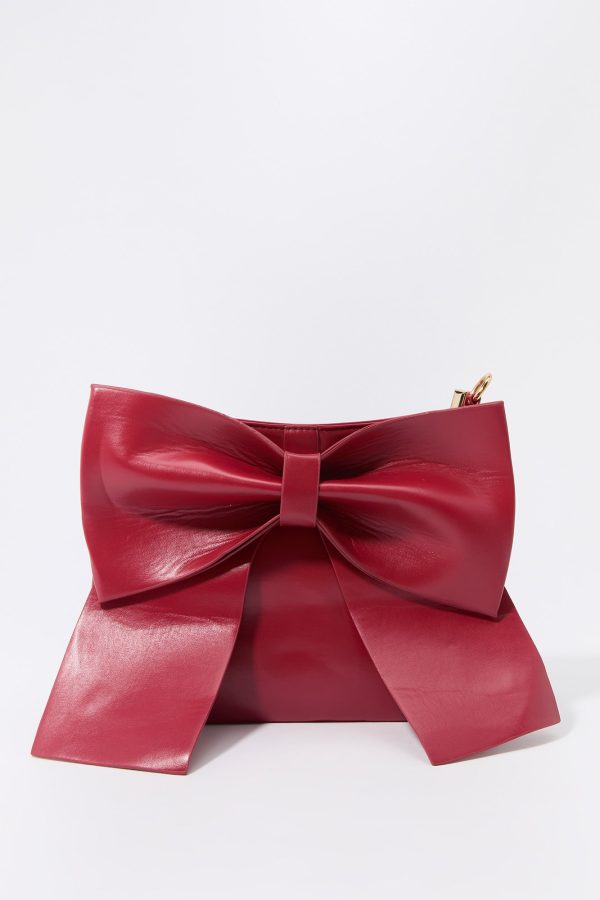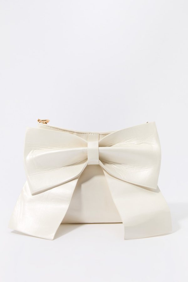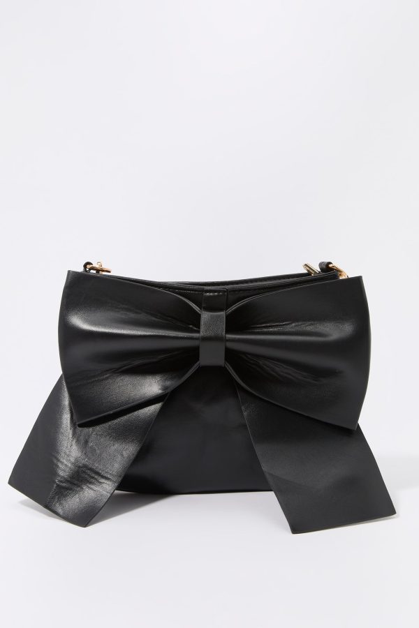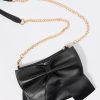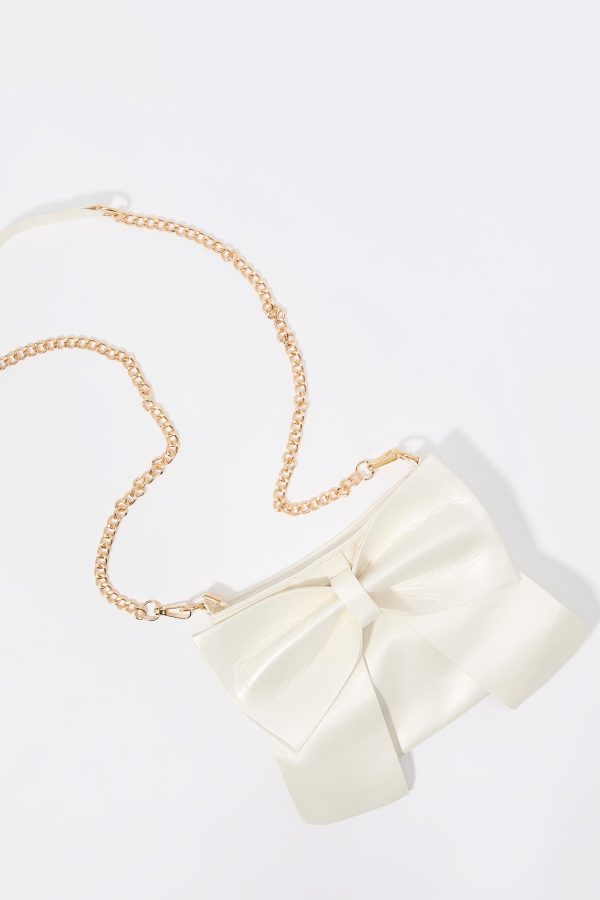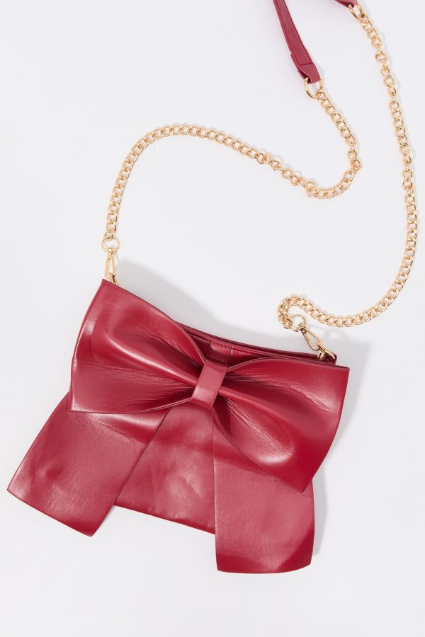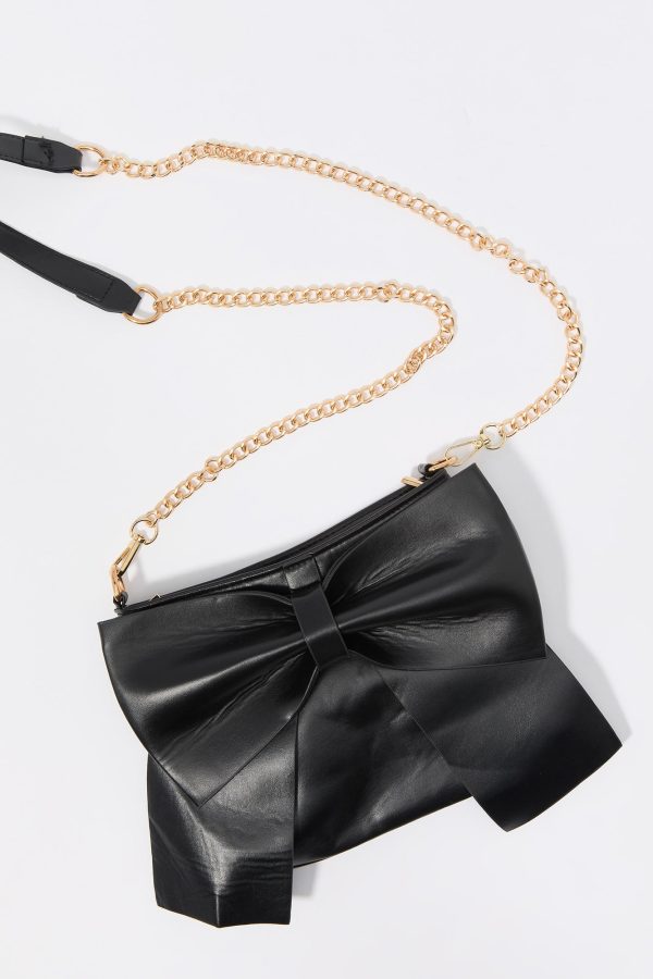 This purse features faux-leather material, large bow, zipper closure, and chain crossbody strap.