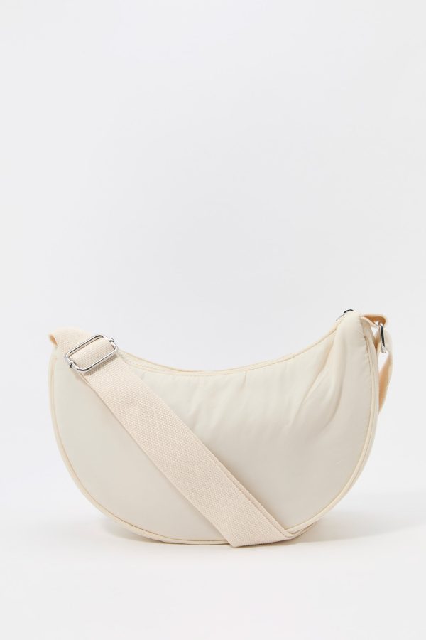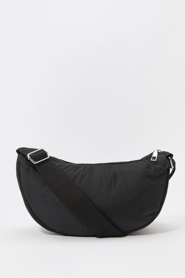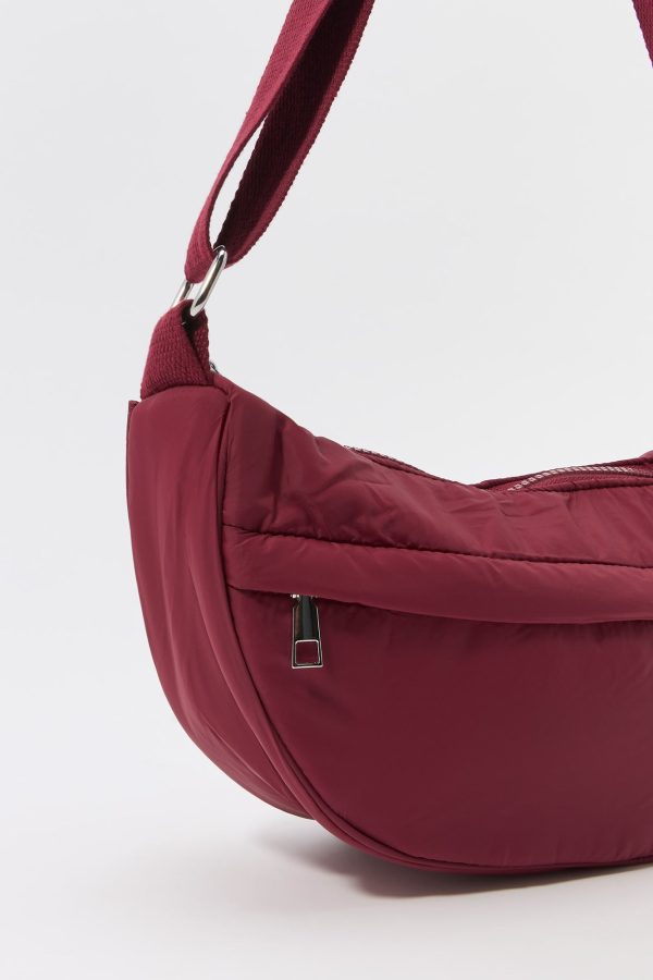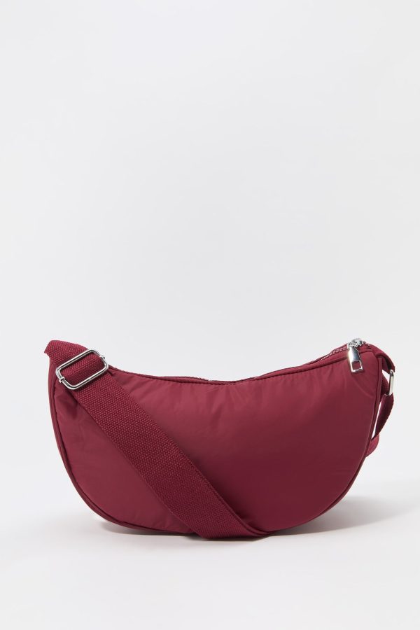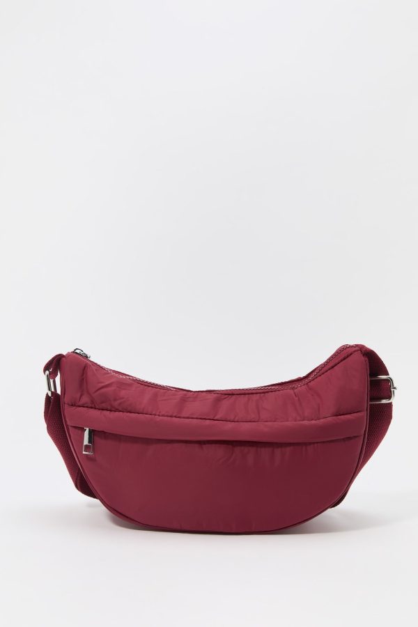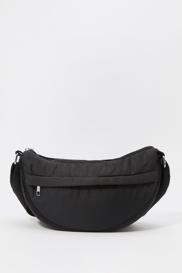 This bag features Nylon material, dual zipper compartments, adjustable strap, and half moon shape.