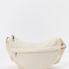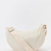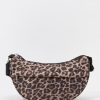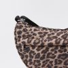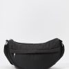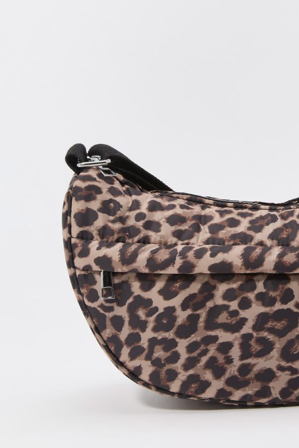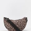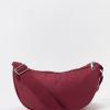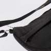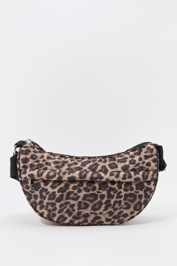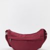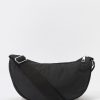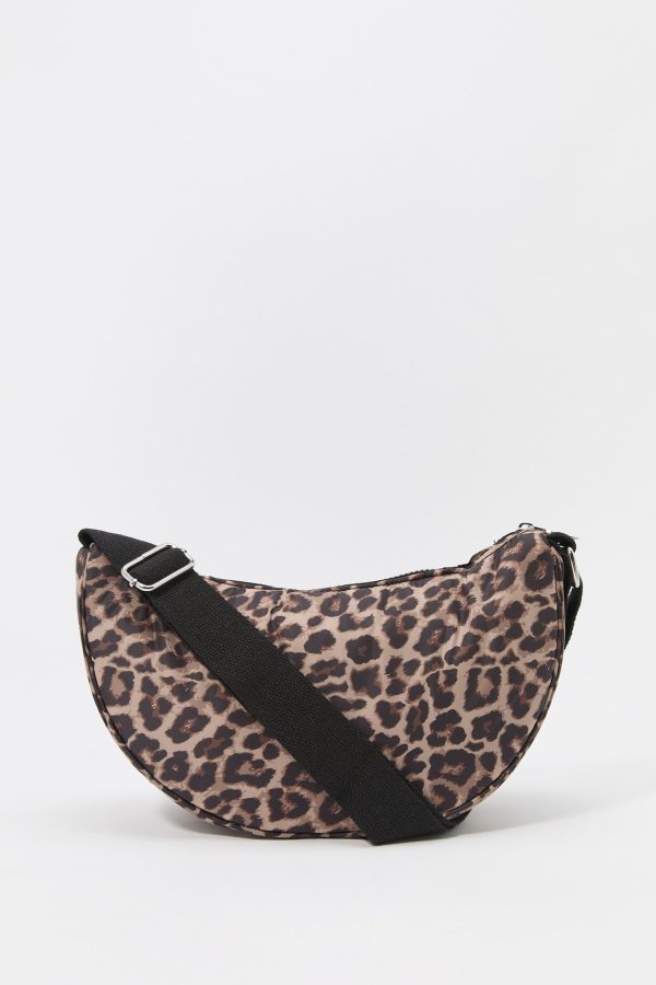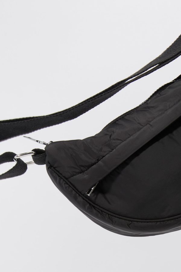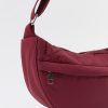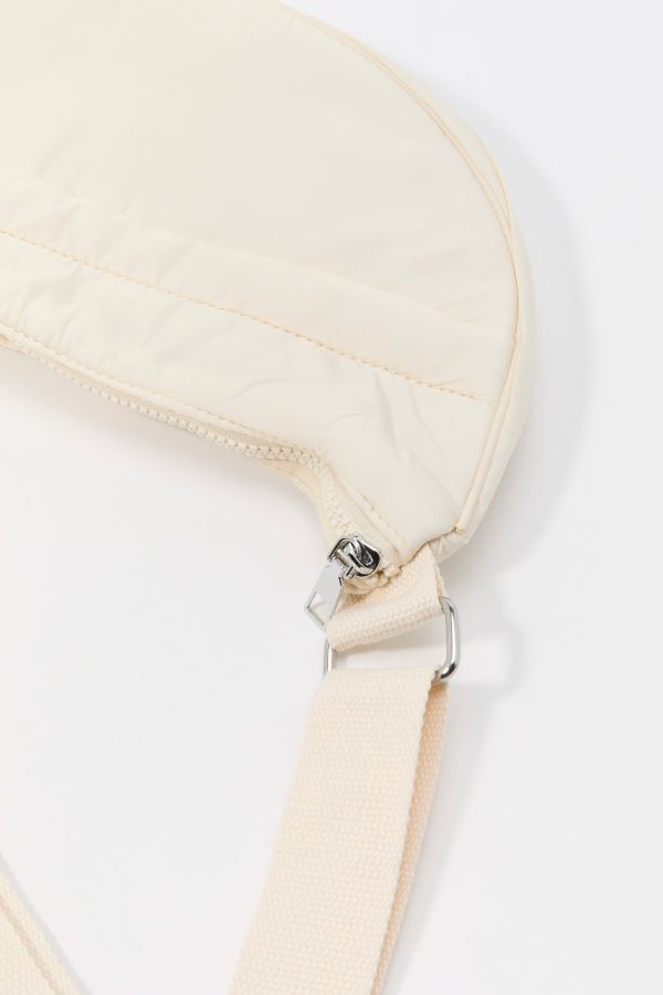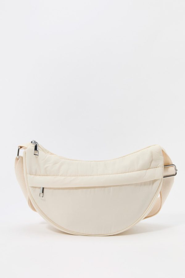 This bag features Nylon material, dual zipper compartments, adjustable strap, and half moon shape.